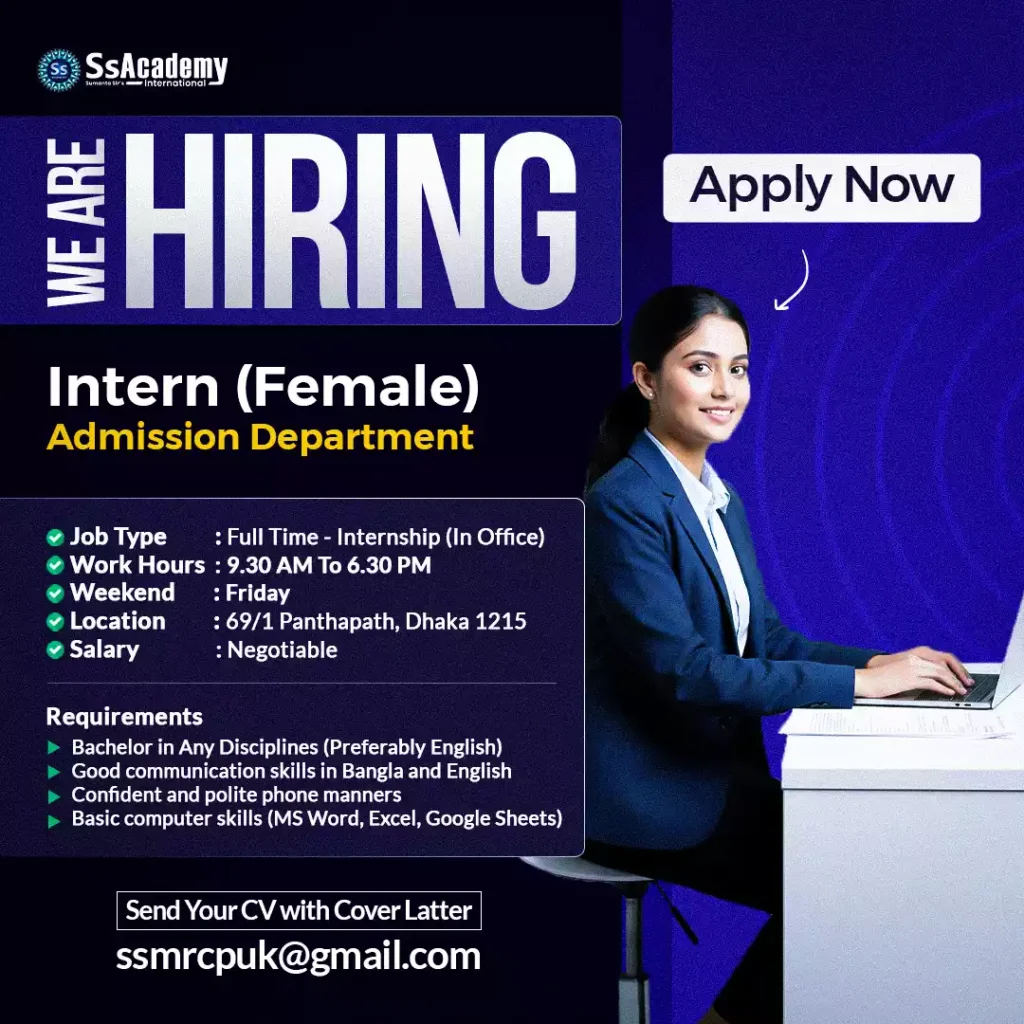 We are hiring a female intern for our Admission Department at SsAcademy International. If you are confident, well-spoken, and eager to learn, we’d love to have you on our team!